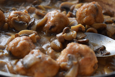 dzisiaj kolejna odsłona uwielbianych przeze mnie ostatnio klopsików drobiowych. Dzisiaj są one w sosie pieczarkowym podawane z kaszą pęczak oraz sosem tzatziki. Dodatkowo klopsiki nie zostały usmażone lecz upieczone w piekarniku – moim zdaniem smakują zdecydowanie lepiej niż te z patelni.