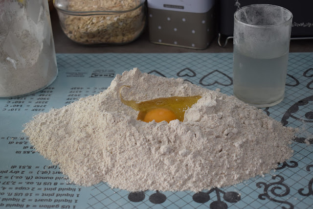 Następnie przygotowałam ciasto na pierogi. Na stolnicę wysypałam mąkę, dodałam jajko i powoli dolewałam wodę.