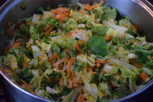 Warzywa przekładamy do garnka. Dodajemy do nich kapustę pekińską.
