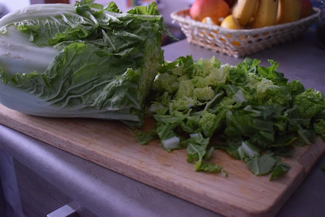 Między czasie kroimy kapustę pekińską – w dość większe kawałki.