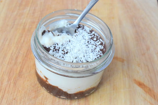 dzisiaj propozycja szybkiego deseru z kubeczka. Jak wiecie uwielbiam wszystko co kokosowe dlatego deser zawiera fantastyczne połączenie czekolady i kokosa. Czy jest coś smaczniejszego? 🙂 Przechowywany w lodówce przed podaniem idealnie sprawdzi się jako chłodny posiłek w upalne letnie dni.