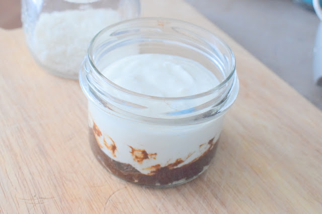 Jogurt grecki łączmy z wiórkami kokosowymi ( około 1 łyżeczki wiórków zostawiamy do posypania na wierzch) oraz ewentualnym słodzikiem. Tak przygotowaną masę przekładamy do kubeczka na masę daktylową.