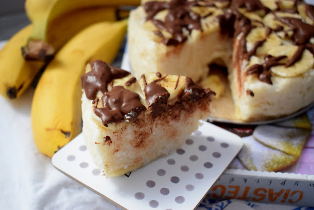 Przestudzoną masę blendujemy a następnie wykładamy na banany. Na wierzch układamy pozostałą część banana także pokrojonego w plastry. W garnuszku rozpuszczamy czekoladę, którą polewamy wierzch ciasta.