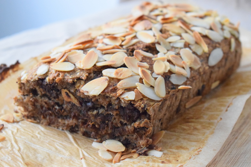Do miski wrzucamy kawałki bananów i blendujemy na jednolitą masę. Dodajemy płatki owsiane, pestki dyni oraz suszone śliwki. Całość ponownie blendujemy. Na koniec wsypujemy pokrojoną w kostkę czekoladę i mieszamy. Tak przygotowaną masę przekładamy do foremki. Wierzch posypujemy płatkami migdałowymi lekko je dociskając do ciasta. Pieczemy w piekarniku nagrzanym do 180 stopni przez około 40 minut.