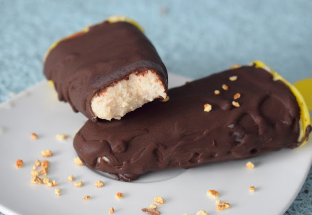 W rondelku rozpuszczamy gorzką czekoladę oraz olej kokosowy. Mieszamy do rozpuszczenia i połączenia składników. Tak przygotowaną polewą polewamy nasze lody.