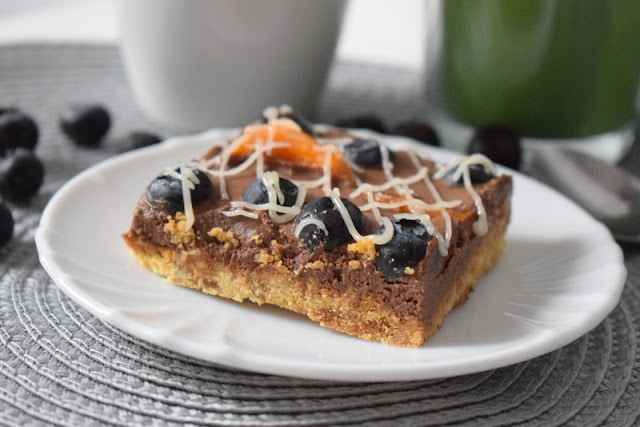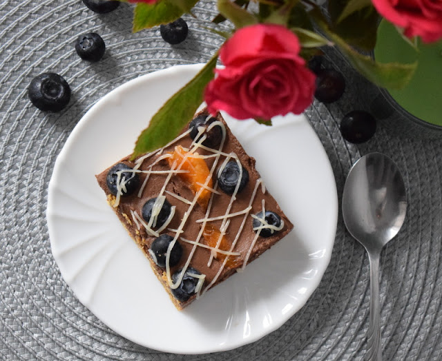 Kiedy masa lekko się zetnie układamy na wierzchu dowolne owoce (u mnie są to borówki i morele). Ponownie chowamy do lodówki – najlepiej na całą noc.